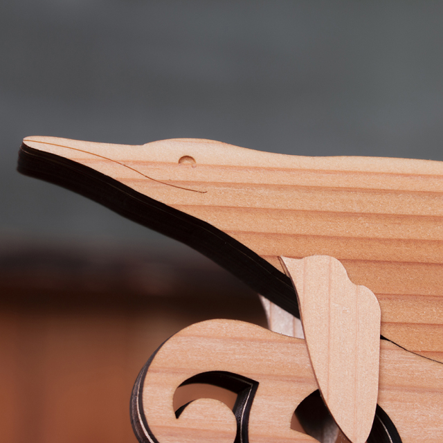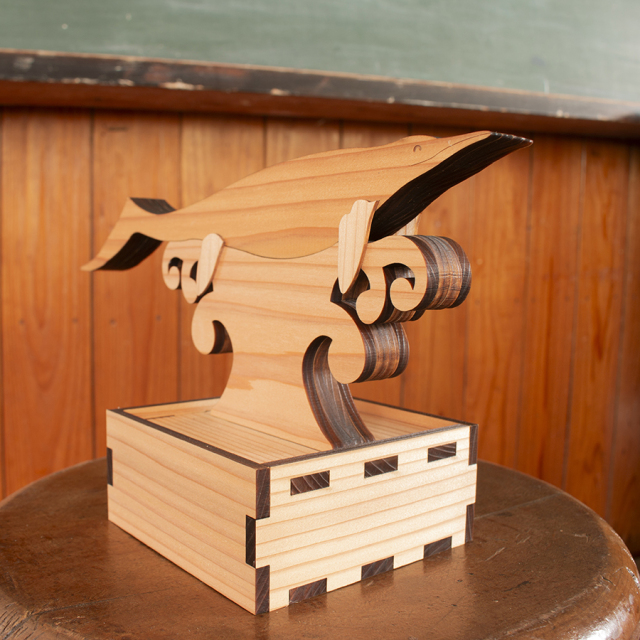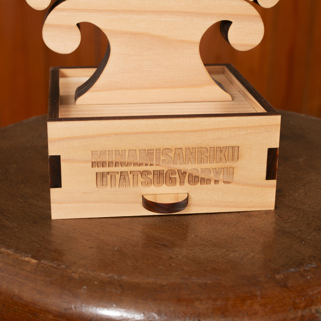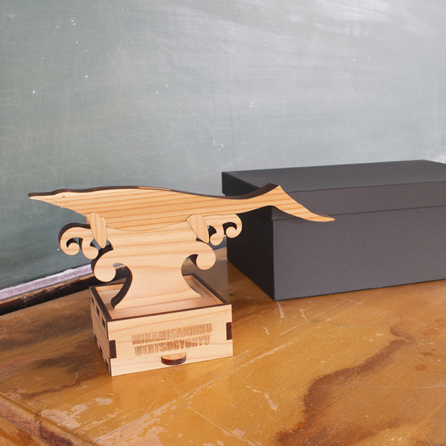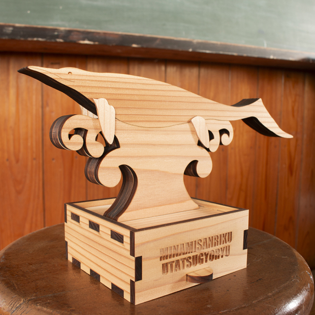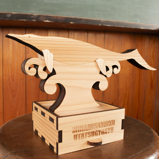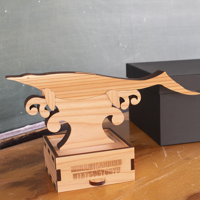 モチーフには、国内では南三陸地域でしか見つかっていない古生物「ウタツギョリュウ(ウタツサウルス)」を、素材には山と海に囲まれた自然豊かな南三陸町の地域資源である「南三陸杉」を使用しました。
