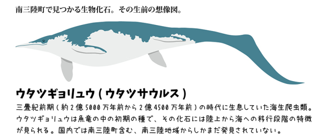 ウタツギョリュウは魚竜の中の初期の種で、その化石には陸上から海への移行段階の特徴が見られます。国内では南三陸町含む、南三陸地域からしかまだ発見されていません。